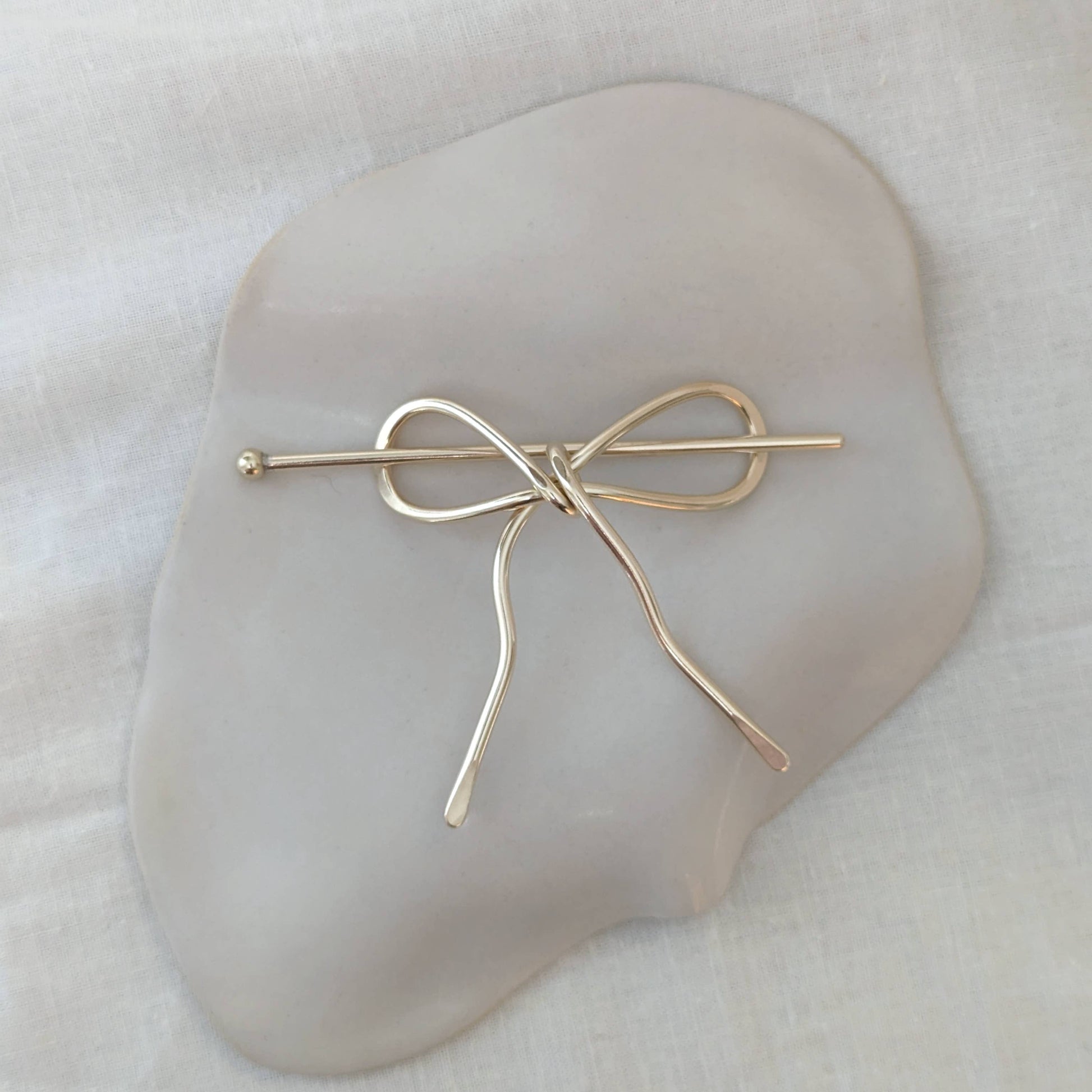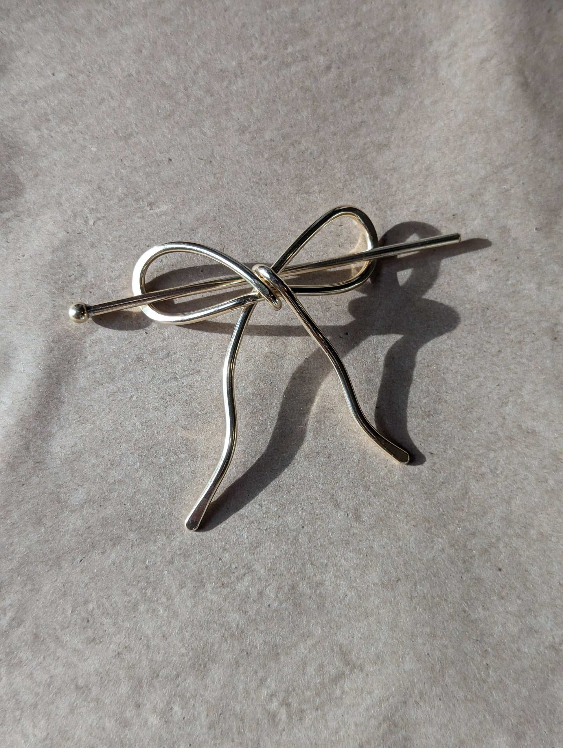 Flex your style with a gold bow hairpin – it's like icing on the cake, but for your hair! Whether you're going for a sweet, cool or classy style this bow is sure to impress!. Great for most hair types and most popularly worn in half-up styles. Experiment with its versatility by adorning your bun, weaving it into your braid, or even use it as an adorable sweater pin. The possibilities are endless! Let's make your hair stand out with a touch of sparkle!