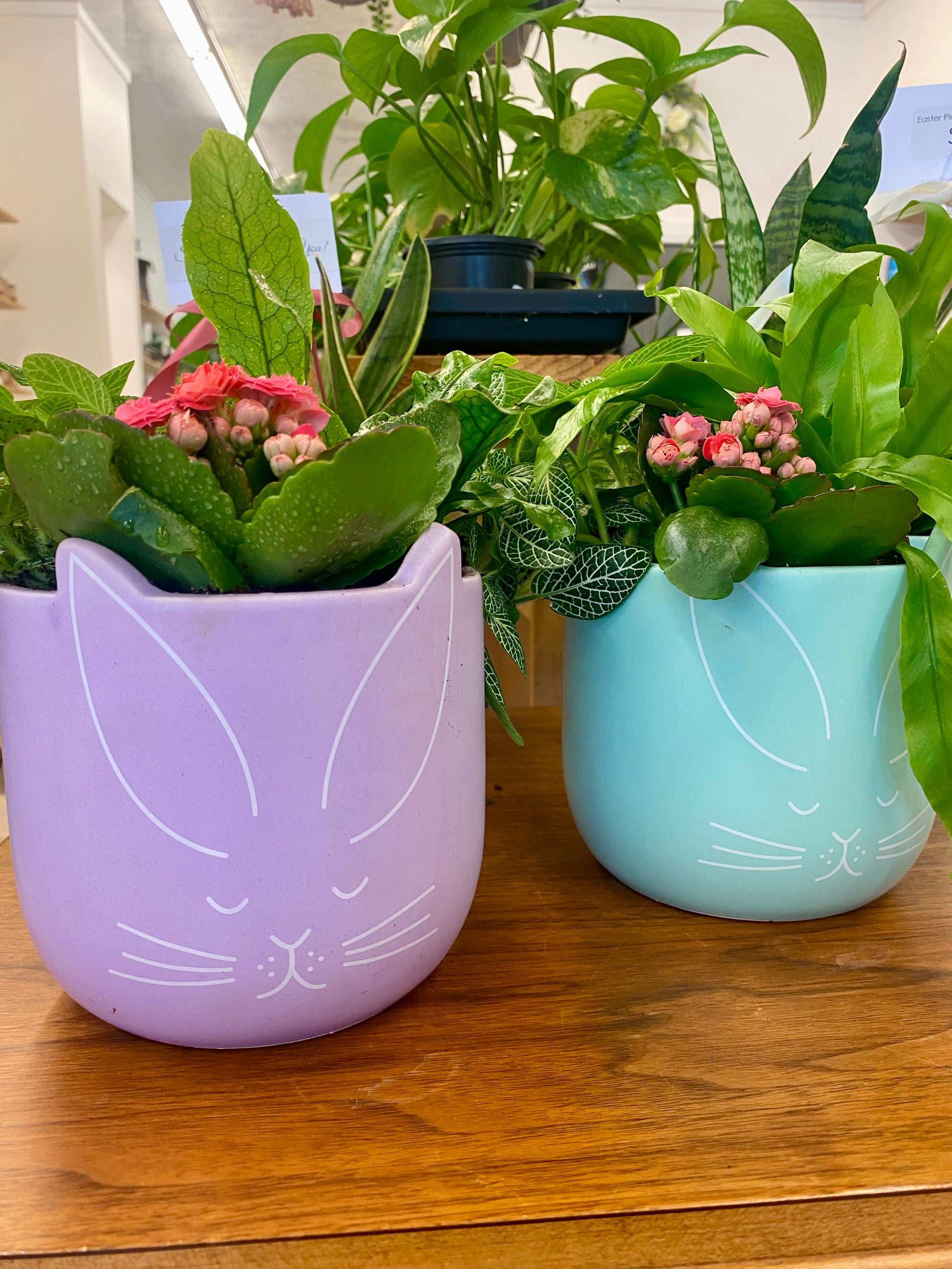 Bring a sweet touch of spring indoors with this adorable 6-inch ceramic bunny planter with saucer featuring a cheerful kalanchoe in bloom paired assorted tropicals. The spring-tone planter adds a playful accent to any space, perfect for Easter gifts, or seasonal décor. Low-maintenance and long-lasting, this living arrangement is as delightful as it is easy to care for.