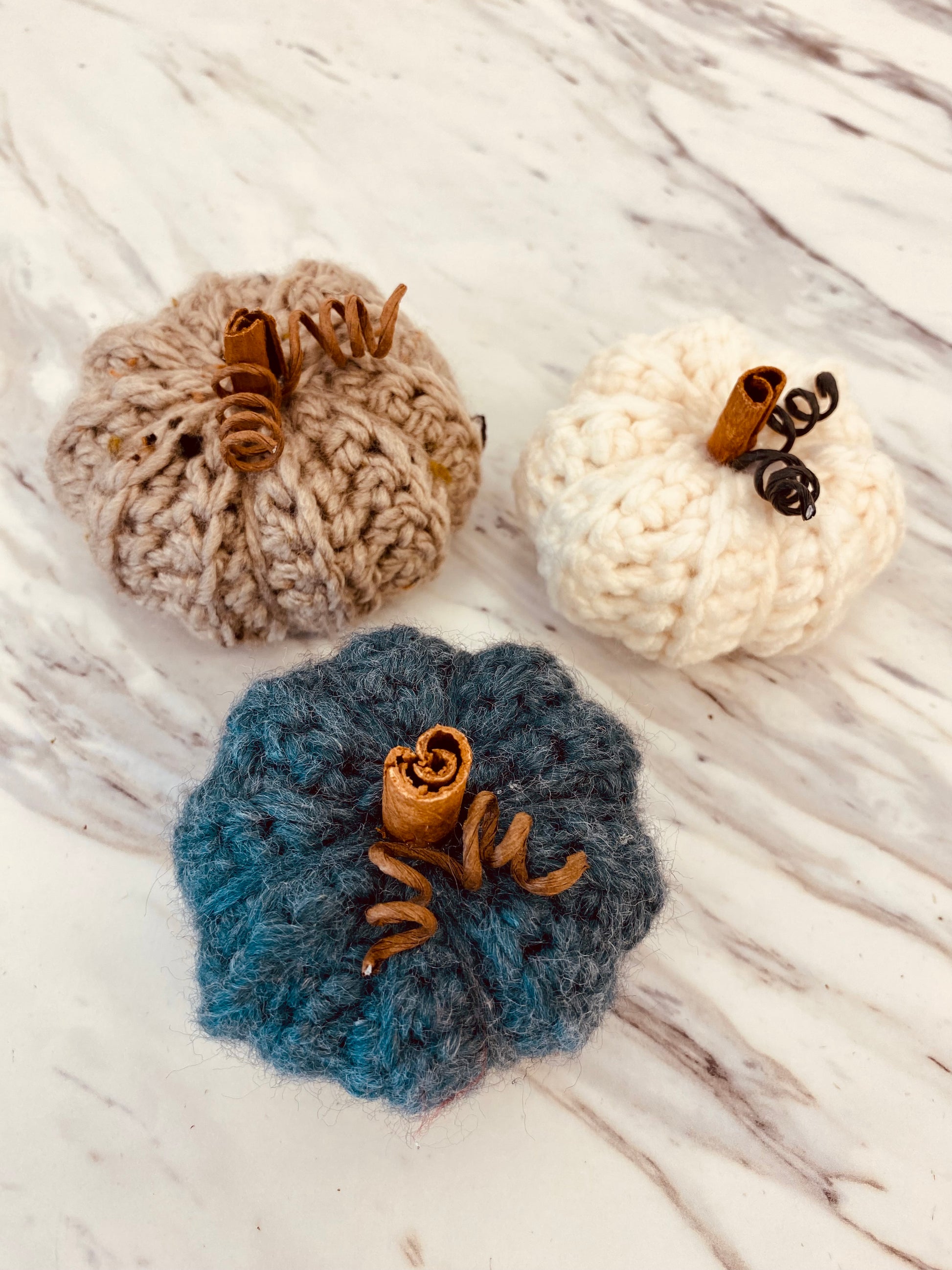 Assorted knit pumpkins handmade in Wellesley, Ontario.