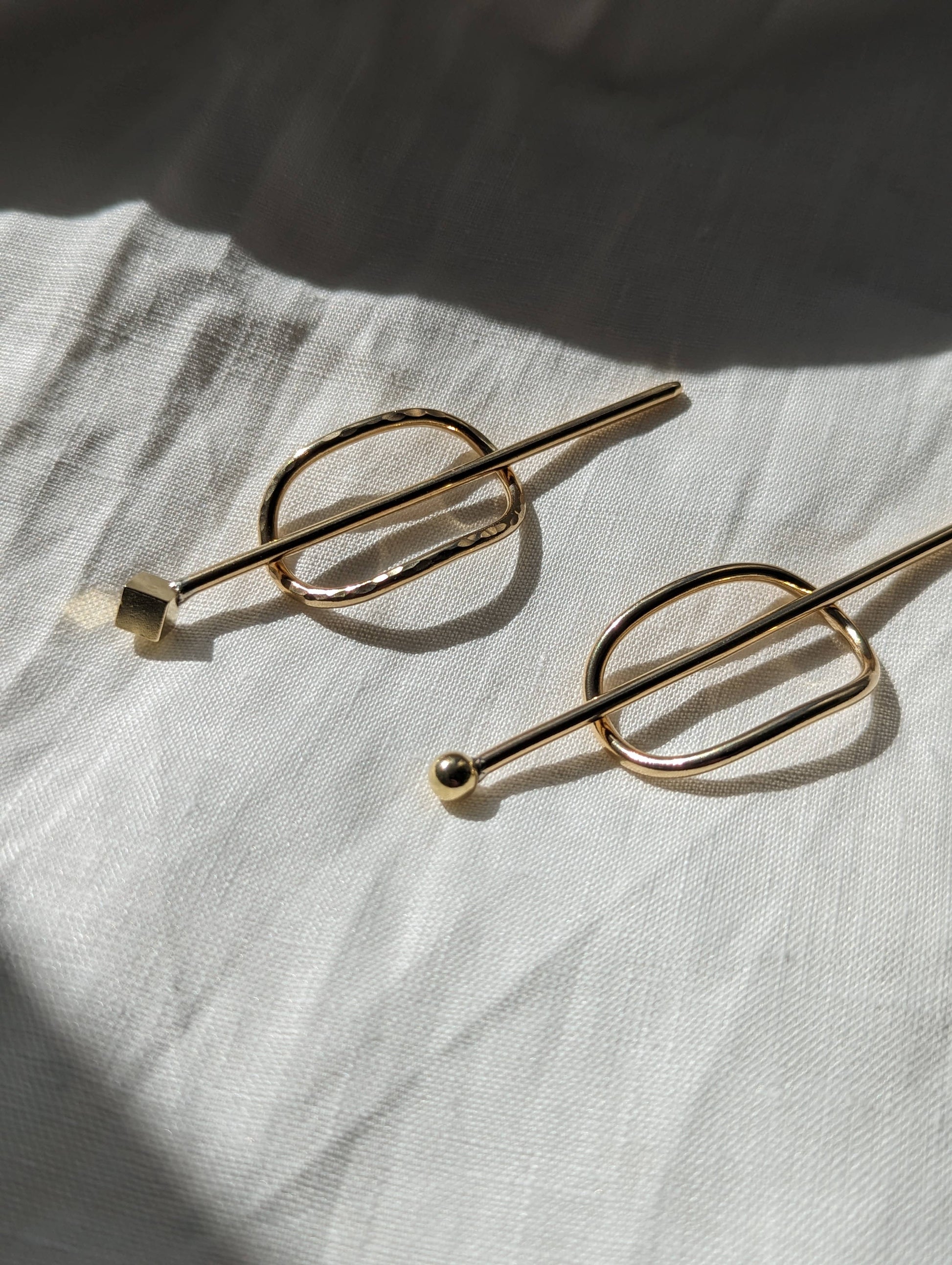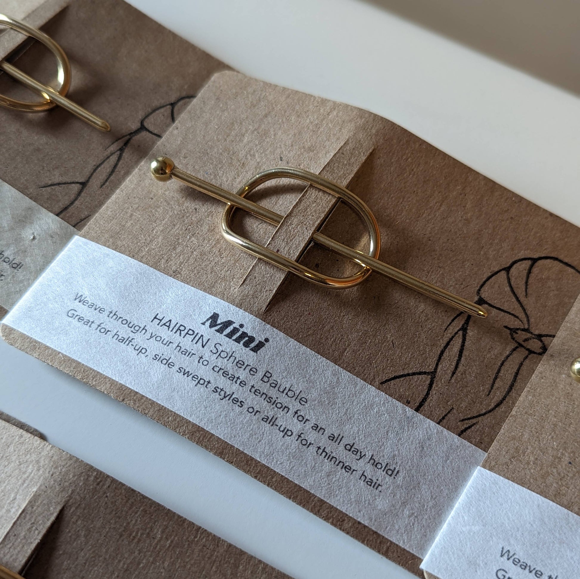 A sleek and simple way to sweep a little hair to the side or back! Holds a small bit of hair much like a small barrette would. A great option for the end of your braid or even a minimalist sweater pin! One size, two finishes: smooth or textured. 1.5 inch small oval sleeve with slight curve 2.5 inch stick pin with 6mm sphere or cube bauble 10 gauge solid brass (2.6mm) Please note that each one is made by hand so you may expect slight variations in shape. *Packaging varies depending on your preferences. By default each hair accessory comes woven onto it's own kraft paper card with general instructions and branding.