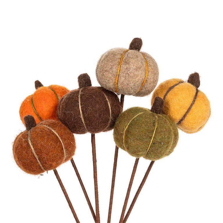 Bring some fun fall colour anywhere with these delightful decorative mini pumpkins picks. Crafted out of polyester felt and styro, these six assorted plush pumpkins come in a variety of autumnal colours to add an adorable decorative accent to floral displays and more.